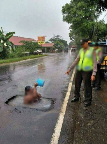 1. Duh, lubang di jalannya justru dipakai emak-emak mandi.