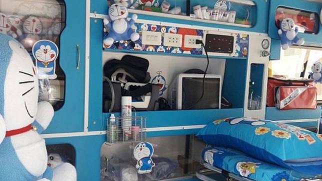 Seluruh bagian dari ambulans, mulai dari tempat duduk, ranjang pasien, hingga langit-langit didekorasi dengan kartun Doaremon.